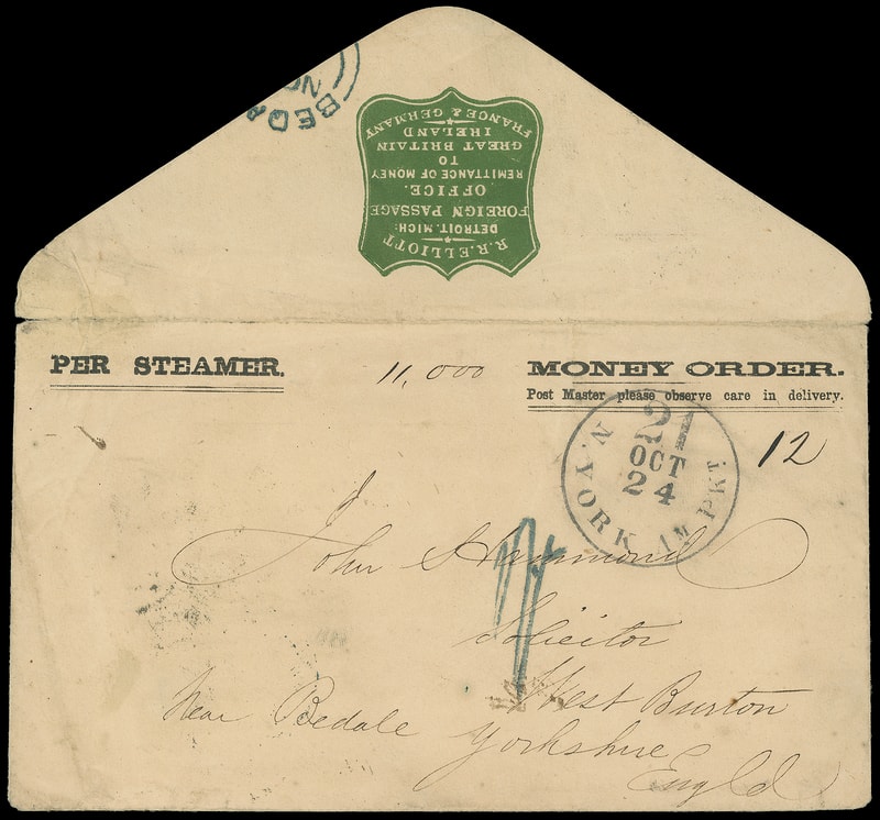 (Transmission of Cash by Money Orders) 1857 (Oct.) Detroit Mich. to West Burton, England, preprinted " Money Order " envelope with green flap cameo " R.R. Elliott, Detroit Mich., Foreign Passage Office, Remittance of Money to Great Britain, Ireland, France & Germany ", carried by privately to New York, entered mails with "N. York Am. Pkt. '21' Oct 24" debit exchange cds, carried transatlantic by Collins Line Atlantic from New York Oct. 27th to Liverpool arriving Nov. 7th, "Liverpool, America" (11.7) transit and " 1/- " shilling debit handstamp, blue Bedale (11.8) arrival backstamp; some wear, Very Fine.