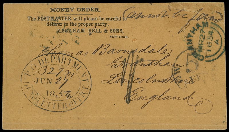 (Transmission of Cash by Money Orders) 1854 (Feb. 1) New York N.Y. to Grantham, England, buff " Money Order " cover with partial "New York '5' Feb 1" debit exchange cds, carried by Cunard Line America from Boston Feb. 23rd to Liverpool arriving Mar. 7th, Liverpool (3.7) entry cds backstamp with "1/-" shilling due handstamp, Grantham (3.8) arrival backstamp, manuscript " Cannot be forwd " and returned to the U.S., "P.O. Department, Dead Letter Office, Jun 27, 1854" oval; top right tear, Very Fine and scarce D.L.O use.