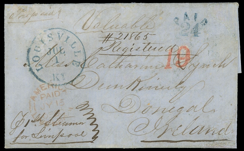 1851 (Jul. 1) Louisville, Ky. to Dunkineely, Ireland, blue folded letter endorsed "Valuable", blue "Louisville Ky. Jul 1" cds and matching "Paid 24" rating handstamp, manuscript "Registered" and "#21865" markings, New York red "19" cent credit handstamp, red Liverpool (7.15) entry cds, Jul. 17th arrival backstamp; cover repaired and reinforced, Very Fine appearance.