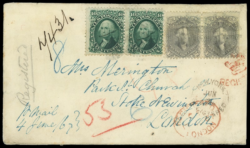 1867 (Jun. 4) New York N.Y. to London, England, double-rate cover bearing 24¢ lilac (78) horizontal pair , s.e. at right, and 10¢ green (68) horizontal pair each with ms. stroke, both tied by quartered cork cancels, matching "New York, Registered, Jun 4" rimless cds with ms. "7431." registry number, light red crayon "48" cent credit, red London Registered (6.17.67) oval and Crown "Registered" handstamp, various registry numbers; right 10¢ small tear and nicked, Very Fine appearance; with 1983 P.F. certificate.