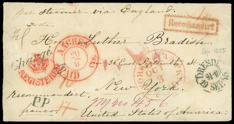 1855 (Sep. 19) Dresden, Saxony, Germany to New York N.Y., amber cover with "Desden, 19 Sep. 55" double-circle with small "P.P." handstamp, brilliant ed "Aachen, Paid Cts. 20/9" double-circle transt and red "Recomandirt" framed handstamp, red London Crown "Registered" handstamp, red "N.York 'Paid 30' Am. Pkt. Oct 3" credit exchange cds and magenta " NY no 456 " registry number; sealed left edge tear, no flap, attractive and Very Fine appearance.