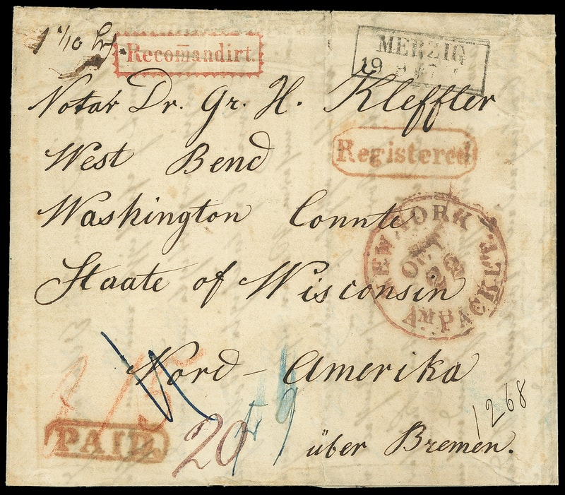 1858 (Sep. 19) Marzig, Prussia to West Bend, Wisc., folded letter with "Merzig, 19/9" framed postmark and red "Paid." framed handstamp with red crayon "f15" sgn indicating German double-rate with with 2 sgn registration paid as per convention, Prussian red "Recomandirt" boxed handstamp, "Bremen, 22 9" framed backstamp and red "Registered" octagon, carried by NDL Line Ariel from Bremerhaven Oct. 2nd to New York arriivng Oct. 21st, red "New York, Am. Packet. Oct 22" exchange cds and ms. "1268" transit registry number; vertical file fold, Very Fine.