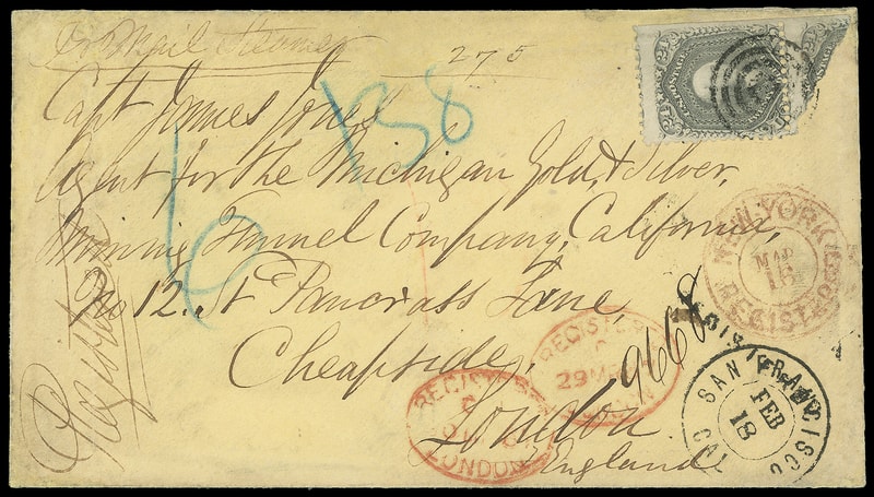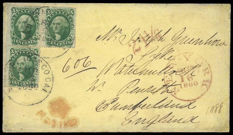 1860 (Sep. 21) San Francisco, Cal. to Watermillock, England, yellow cover bearing 10¢ green (35) block of three , tied by two strikes of "San Francisco, Cal. Sep 21, 1860" cds with ms. "606" registry number adjacent, red "New-York, Oct 16, 1860" registry transit cds with matching "21½" credit handstamp, magenta "1088" at lower right, Liverpool (10.28) entry and Dublin (10.28) transit backstamps, red Crown "Registered" handstamp; repair tear and edge flaws, no flap, Fine appearance, a rare example of the New York "21½" registry credit .