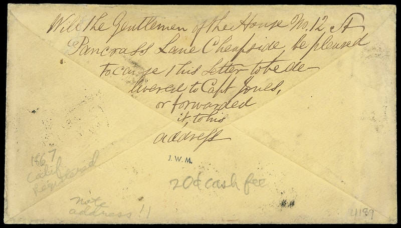 The 28¢ debit (1s/2d) to U.S. for 8d private ship rate plus 6d G.B. registration. The 49¢ final due rating for 37¢ collect private ship letter rate plus 12¢ British registration fee.