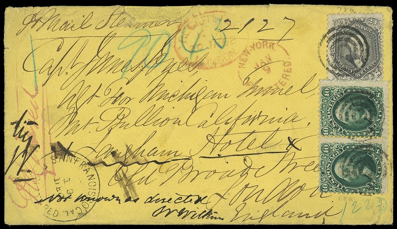 1867 (Dec 19) San Francisco Cal. to London, England, yellow cover bearing 10¢ green (68) pair and 24¢ grayish lilac (78a) , each tied by four-ring cancel, matching "San Francisco, Registered, 19 Dec" cds, red "New-York, Registered, Jan 9" rimless cds with ms. "2127" registry transit number, red "Registered, London, 30 JA 68" arrival oval and blue crayon "1" and "9043" numbers, original letter; top edge mend and flap torn, F.-V.F.