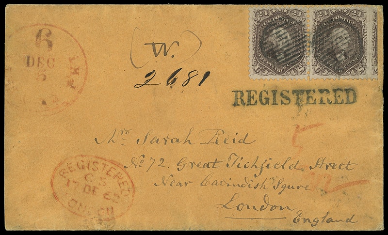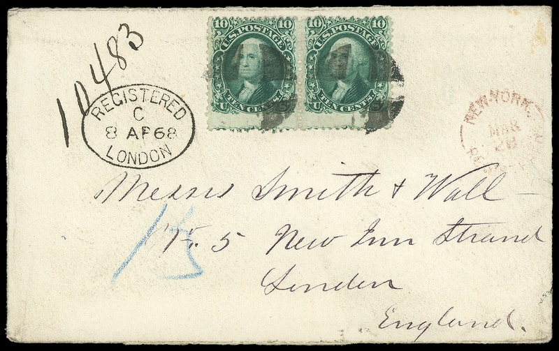 On January 1, 1868, the registry rate to Great Britain was reduced to 8¢ payable in stamps. This cover was prepaid 20¢ for the 12¢ treaty rate plus 8¢ registry rate. A similar domestic cover at this time would cost 23¢ for 3¢ postage plus 20¢ registry fee.