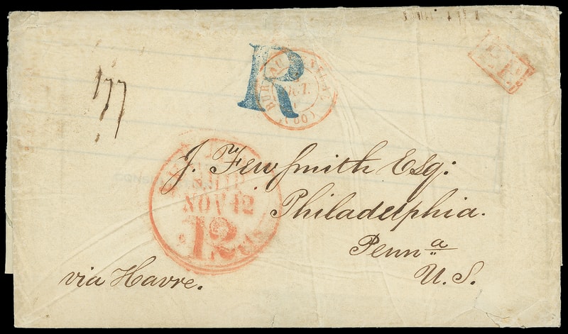 1845 (Oct. 3) Paris, France to Philadelphia Pa. via New York, folded cover with red "Bureau Central, 4 Oct 45" cds and matching "PD" framed handstamp, Havre (10.4) transit backstamp, red "New-York 'Ship 12 cts' Nov 12" intregral-rate cds for double 5¢ postage plus 2¢ ship, bold blue Philadelphia " R " registry handstamp and "177" number; some edge wear and wrinkles, F.-V.F. and rare.