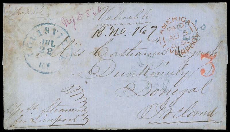 1855 (Jul. 22) Louisville Ky. to Dunkineely, Ireland, blue folded letter with blue "Louisville Ky. Jul 22" cds and matching "Paid 24" rating, endorsed " Valuable " at top center and ms. "R. No. 162" below, New York red "3" cent credit h.s. and magenta "Ny D 530" registry number, carried by Collins Line Pacific from New York departing New York Jul. 25th to Liverpool arriving Aug. 5th, red "America, Paid, Liverpool, AU 5, 55" rimless entry cds, reverse with Donegal (8.7) transit and "Dunkineely, Donegal" two-line arrival; cover restored with some toning, Fine appearance, an early transatlantic registry use to Ireland.