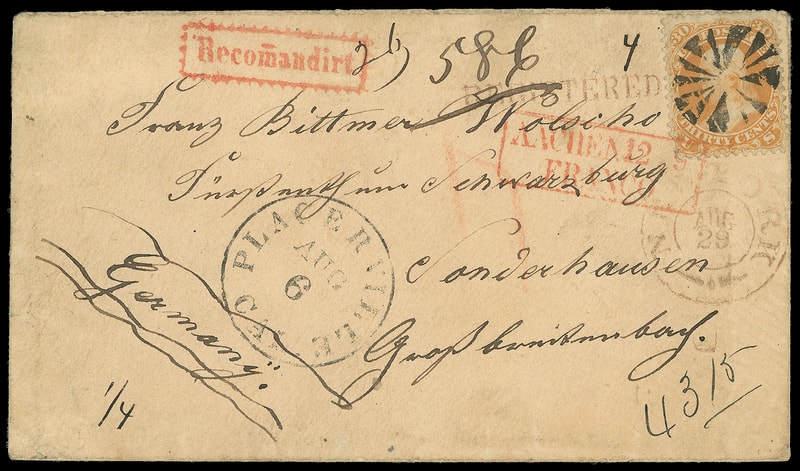 1863 (Aug. 6) Placerville Cal. to Sondershausen, Germany, buff cover with "Placerville Cal. Aug 6" cds with matching circle of wedges cancels 30¢ orange (71) , ms. "586" registry number, red "New-York, Aug 29" flueron cds and matching "Registered" straightline with ms. "4315" number at bottom right, red "Aachen, Franco, 12/9" framed transit ties 30¢, red "Recomandirt" framed handstamp, arrival backstamps; 30¢ small flaws, Very Fine and scarce registered use.
