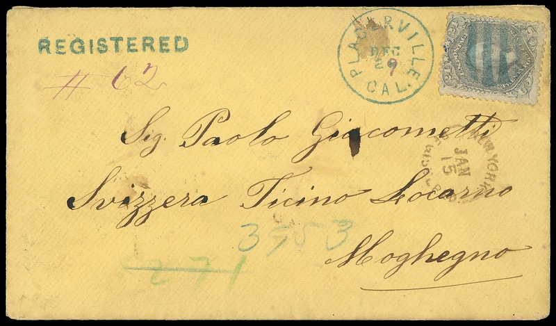 1869 (Dec. 29) Placerville Cal. to Moghegno, Switzerland, yellow cover bearing 24¢ grayish lilac (78a) canceled by blue grid duplexed with "PLacerville Cal., Dec 29", matching bold "REGISTERED" straigthline and purple "#62" registry number, red "New-York, Registered, Jan 15" rimless cds with green crayon "271" number updated to "3753" in blue crayon, reverse with Basel (1.28) and Locarno (1.30) transits; 24¢ nicked, stain in cds, flap torn, Fine, ex-Hyzen .