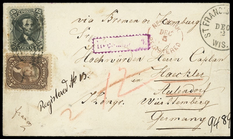 1867 (Dec. 2) St. Francisville, Wisc. to Aulendorf, Germany, cover with partial "St. Francisville, Wis. Dec 2" cds and matching targets tie 5¢ brown (76) and 15¢ black (77) , red "New-York, Registered, Dec 5, 1867" rimless cds with ms. "9489" registry number at bottom right, red crayon "12" credit rating, purple "Recomandirt" framed handstamp, reverse with Dec. 19th railroad transit and partial Alendorf arrival backstamp; reduced at right with small edge tear, 15¢ couple flaws, F.-V.F. and rare use with stamps paying registry fee.