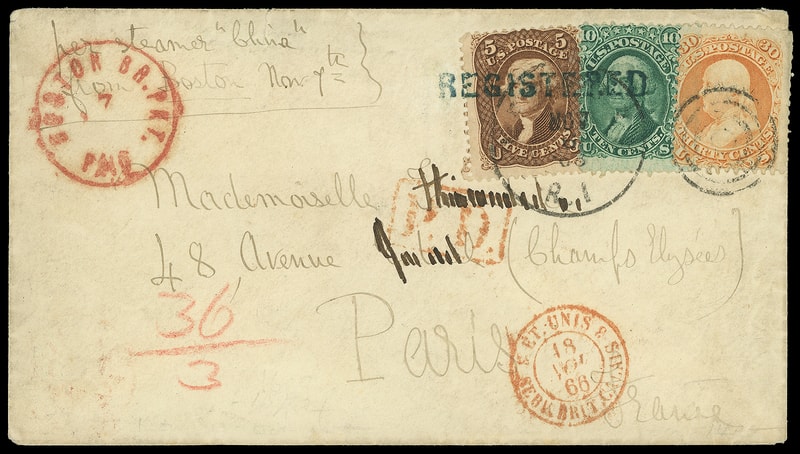 1866 (Nov. 6) Newport R.I. to Paris, France, cover bearing 5¢ red brown (75) , 10¢ green (68) and 30¢ orange (71) , corner crease, tied by "Newport R.I. Nov 6 '66" duplex and blue "REGISTERED" straightline (Milgram R-NT-2) , bold red "Boston Br. Pkt. 'Paid' 7 Nov" exchange cds with red crayon "36/3" triple-rate credit, red Calais (11.18) entry cds; addressee partially scribbled out, flap tear ends in small edge tear; accompanied by off-cover 3¢ rose (65) canceled by part of same blue straightline, Very Fine.