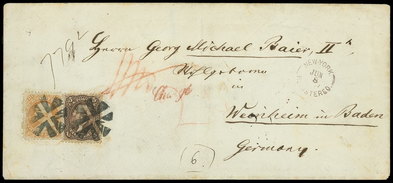 1867 (Jun. 8) New York N.Y. to Weinheim, Baden, Germany, legal-size registered entire with reddish brown "New-York, Registered, Jun 8" rimless postmark (R-NY-10) bearing 5¢ brown (76) and 30¢ orange (71) tied by bold cross-roads cancels, red crayon "24" cent credit, Hamburg red " Chargé " handstamp, reverse with blue Hamburg (6.24), Heidelberg-Basel (6.26) transits and Winhiem (6.26) arrival cds, Very Fine and exceedingly early use after June 1st prepayment requirement.