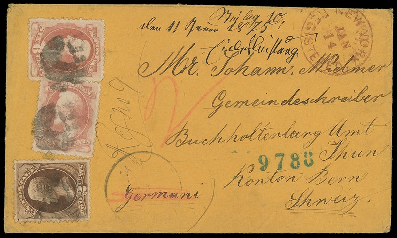 1875 (Jan. 14) New York town to Thun, Switzerland, orange buff cover bearing 2¢ brown (146) and two 6¢ dull pink (159) singles, each canceled by cork cancel duplexed with indistinct town, red "New York, Registered, Jan 14" double-circle datestamp and blue "9788" registry number handstamp, red crayon "2", reverse with Basel (1.29.75) transit and Thun (1.30) arrival cds; flap torn, Very Fine.