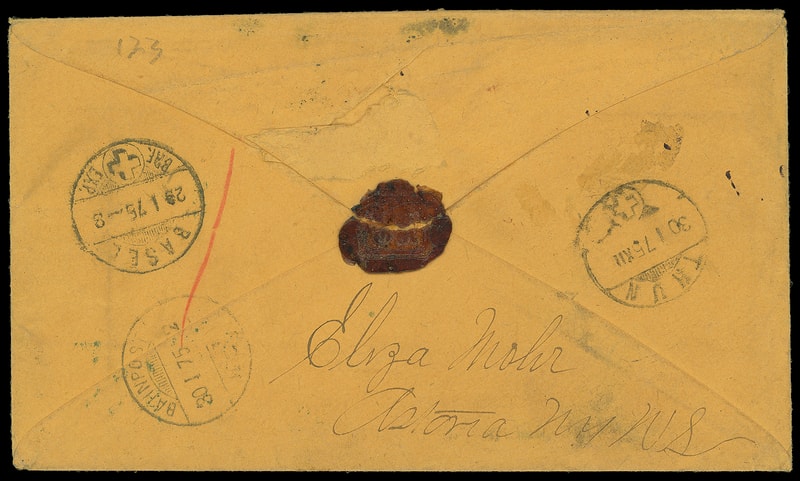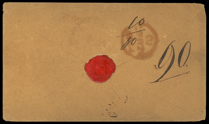 The small New York rimless registry cds without year date was used from 1868 to 1872, struck in red on foreign mail and black on domestic registered mail.Lot 458