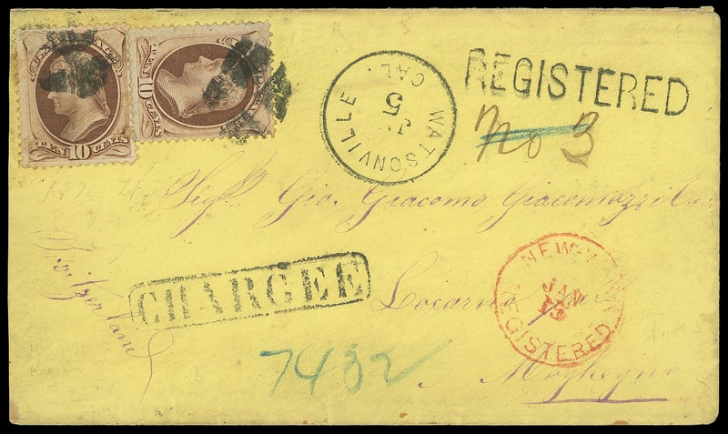 1873 (Jan. 5) Watsonville, Cal. to Locarno, Switzerland, yellow cover bearing two 10¢ brown (150) singles, each tied by quartered cork duplexed with "Watsonville Cal. Jan 5" cds, matching "REGISTERED" straightline with ms. "No 3" number, red "New-York, Registered, Jan 15" double-circle cds and blue crayon "7432" registry number, reverse includes Basel (1.29) transit and Locarno (1.31) arrival cds, "Chargee" framed handstamp; reduced slightly at left, Very Fine.