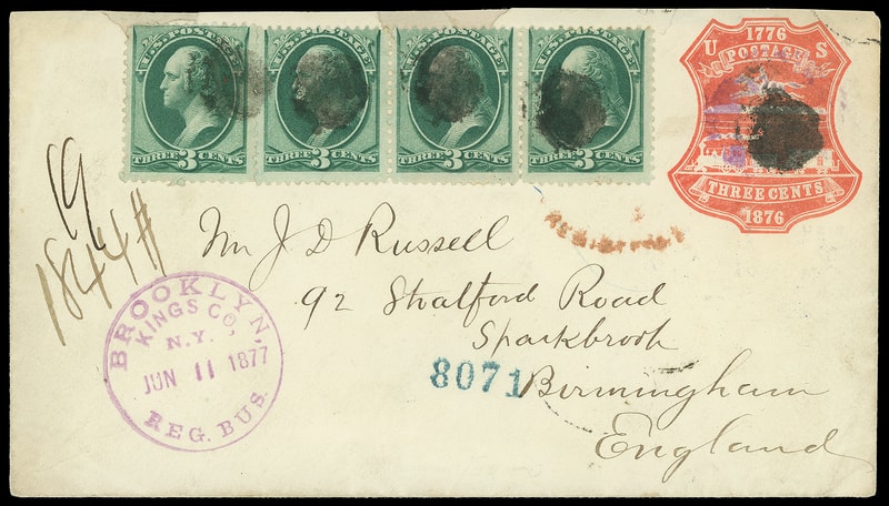 1877 (Jun. 11) Brooklyn N.Y. to Birmingham, England, 3¢ vermilion (U218) bearing 3¢ green (158) strip of three and single, each canceled by cork, purple "Brooklyn, Kings Co., N.Y., Reg. bus. Jun 11, 1877" cds and ms. "1844" registry number, blue "Registered, Jun 12 1877, New York P.O." three-line backstamp and two strikes of fancy flap seal handstamps, partial London red "Registered" handstamp, Birmingham (6.22) arrival backstamp, flap with "Post Office, Brooklyn N.Y." Eagle wax seal; couple top edge mends, opened on three sides for display, fresh and Very Fine, a scarce County registry postmark .