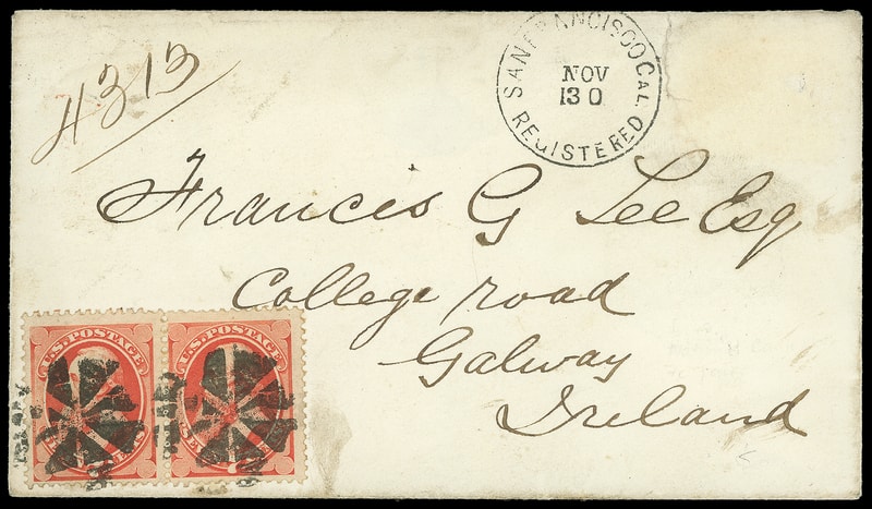 1872 (Dec. 18) San Francisco Cal. to Galway, Ireland, cover bearing 7¢ orange vermilion (160) horizontal pair tied by circle of wedges, matching "San Francisco, Cal. Registered, Nov 30" cs with ms. "4313" registry number, reverse with Dublin (12.17) and Galway (12.18); edge tear, couple light stains, F.-V.F., cover prepaid for 6¢ treaty rate plus 8¢ registry fee.
