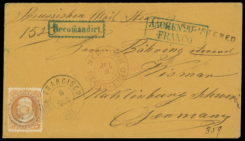 1865 (Jun. 8) San Francisco Cal. to Wismar, Germany, orange cover bearing 30¢ orange (71) , couple short perfs, canceled by four-rings and tied by "San Francisco Cal., 8 Jun 1865" cds, matching "Registered" straightline and ms. "1523" registry number, red "New-York, Registered, Jul 8" cds and ms. "359" registry transit number, blue "Aachen, Franco, 20/7" framed transit and matching sharp "Recomandirt" framed handstamp, German (7.21) arrival cds; sealed edge tear and reinforced, Very Fine appearance, ex-Baker .