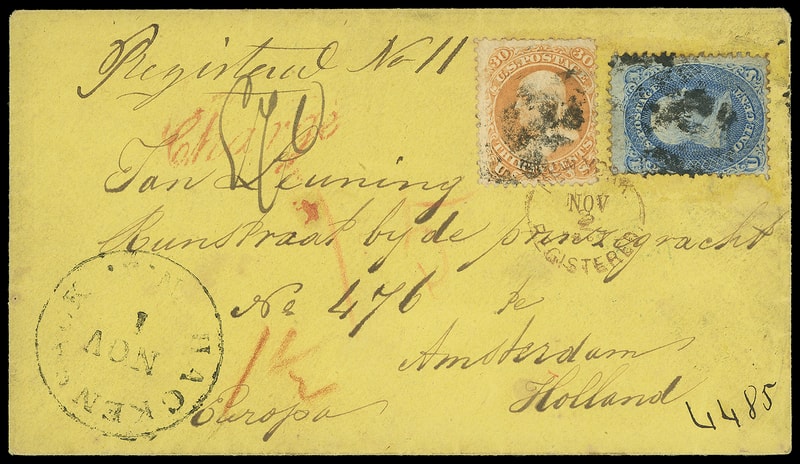 1867 (Nov. 1) Hackensack, N.J. to Amsterdam, Holland, yellow cover bearing 1¢ blue (63) and 30¢ orange (71) , each tied by cork cancel, matching "Hackensack N.J. Nov 1" cds and ms. "Registered No 11" at top, red "New-York, Registered, Nov 2, 1867" rimless cds also ties stamps with ms. "4485" transit number at lower right, red crayon "15" credit, blue Hamburg (11.18) transit backstamp with red crayon "1½" credit rating, red Amsterdam (11.7) arrival cds, red " Chargé " script handstamp, ms. rating, Very Fine.