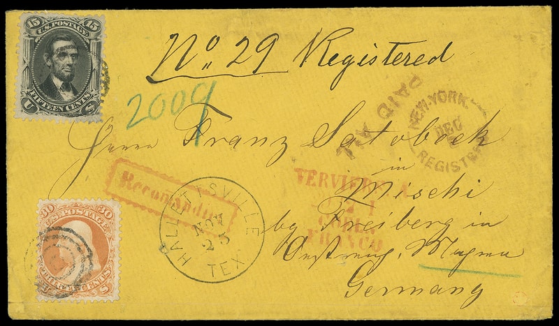 1868 (Nov. 25) Hallettsville, Texas to Freiberg, Germany, orange cover bearing 15¢ black (77) and 30¢ orange (71) , each tied by four-ring cancel, matching "Hallettsville, Tex. Nov 25" cds and ms. "No. 29 Registered", red "New-York, Registered, Dec 8" rimless cds with matching "Paid All" straightline and blue crayon "2009" number, red "Verviers-Coeln, Franco, 29 12" transit with "Recomandirt" framed handstamp, Freilberg (12.31.68) arrival backstamp, reverse with registry receipt remnant; 15¢ corner repaired, Very Fine appearance.