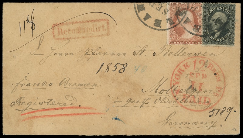 1858 (Sep. 7) Albany N.Y. to Molbergen, Oldenburg, Germany, registered buff cover bearing 3¢ dull red (26) and 12¢ black (36) , tied by two strikes of "Albany N.Y. Sep 7" cds, sender's directive "franco Bremen Registered", manuscript registry numbers, red "N. York Brem. Pkt. '12 Paid' Sep 11" credit exchange cds, carried on NGL New York departing New York Sep. 11th to Bremen arriving Sep. 24th, red serrated frame "Recomandirt" handstamp; 3¢ trimmed at top, otherwise Very Fine and rare 1857 issue registered transatlantic use.