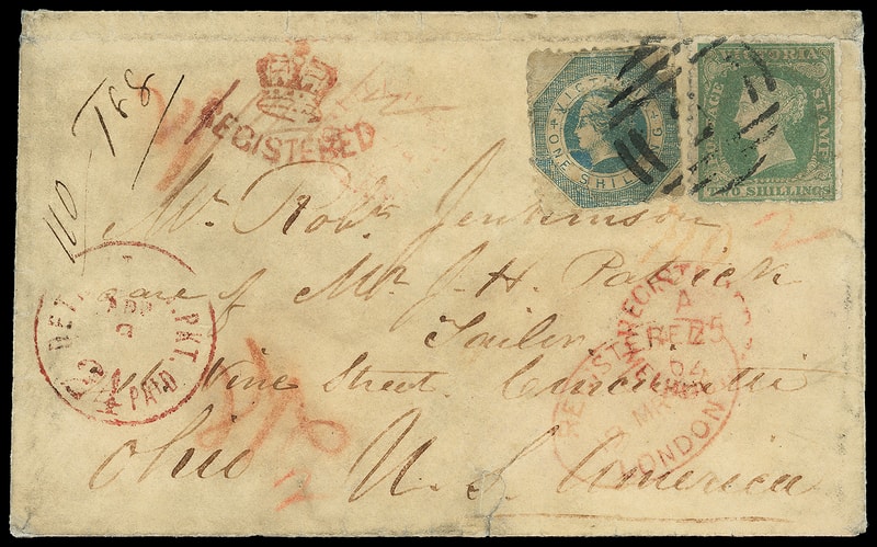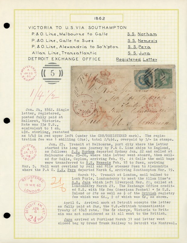 1862 (Jan. 25) Ballarat, Victoria to Cincinnati, Ohio, registered cover bearing Victoria, 1s blue (25), 2s green , tied by numeral barred oval, light strike of red "Victoria, Ballarat, JA 25 '62" rimless cds, red "Registered, Melbourne, JA 25, 62" rimless transit cds, red manuscript " 1/4½ " (33¢) credit to G.B., carried by P&O Northam from Melbourne Jan. 26nd to Galle arriving Feb. 15th, P&O Nemesis Feb. 18th to Suez arriving Mar. 5th, and P&O Pera from Alexandria Mar. 6th to Southampton arriving Mar. 19th, red Registered London (3.19) oval transit and matching "Registered" crown handstamp, magenta " 21/6 " credit to U.S., carried by Allan Line Jura from Liverpool Mar. 20th to Portland Me. arriving Mar. 31st, closed bag by Grand Trunk Railway to Detroit via Montreal, red "Detroit Am. Pkt. '24 Paid' Apr 6" exchange cds; cover and 1s repaired, Fine appearance, a rare Detroit exchange office registered use, ex-Arthur White .