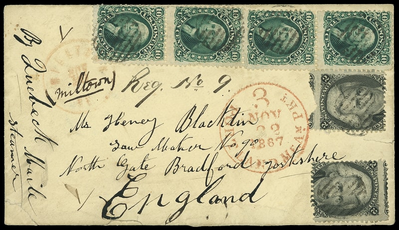 1867 (Nov. 20) Milltown Me. to Bradford-Yorkshire, England, registered cover bearing two 2¢ black (73) singles and two 10¢ green (68) vertical pairs , small faults, grid cancels, red "Milltown Me. Nov 20" cds with ms. "Reg. No. 9." registry number, red "Portland Me. Am. Pkt. '3' Nov 22, 1867" credit datestamp, ms. "By Quebeck Mail Steamer" routing, carried by Allan Line Hibernian from Quebec Nov. 27th to Londonderry arriving Dec. 4th, Bradford-Yorks (12.6.67) arrival backstamp, ms. docketing "…recd the sum of 101.50 to retire bill due 7/10cts inst."; couple small opening tears at bottom, small tear at right, otherwise Very Fine cover, otherwise Very Fine cover, ex-Arthur White, Friedman .