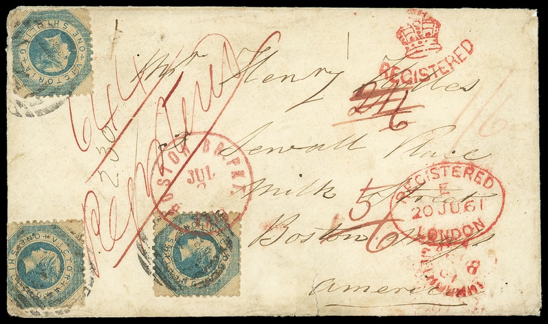 1861 (Apr. 6) Castlemaine, Victoria to Boston Mass. via London, registered cover bearing Victoria, 1s blue (25) three singles, each tied by numeral barred oval, matching "Castlemaine, Victoria, AU 6, 61" rimless oval backstamp, red "Registered, Melbourne, AU 8, 61" rimless cds, red manuscript " 1/6 " (32¢) credit to G.B. rating, carried by P&O Northam from Melbourne Apr. 26th to Galle arriving May 15th, P&O Simla May 19th to Suez arriving Jun. 5th, and P&O Ceylon from Alexandria Jun. 6th to Southampton arriving Jun. 20th, red Registered London (6.20) oval transit and matching "Registered" crown handstamp, magenta " 21/6 " crossed out and updated to " 5/6 " credit to U.S., carried by Cunard Line Persia from Liverpool Jun. 22nd to New York arriving Jul. 3rd, bold red "Boston Br. Pkt. 'Paid' Jul 3" exchange cds; some edge wear, one 1s faulty and second folded over edge, a Very Fine and rare registered use to the United States, ex-Forster .