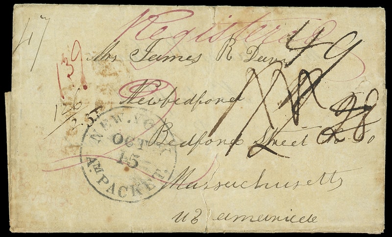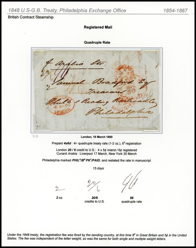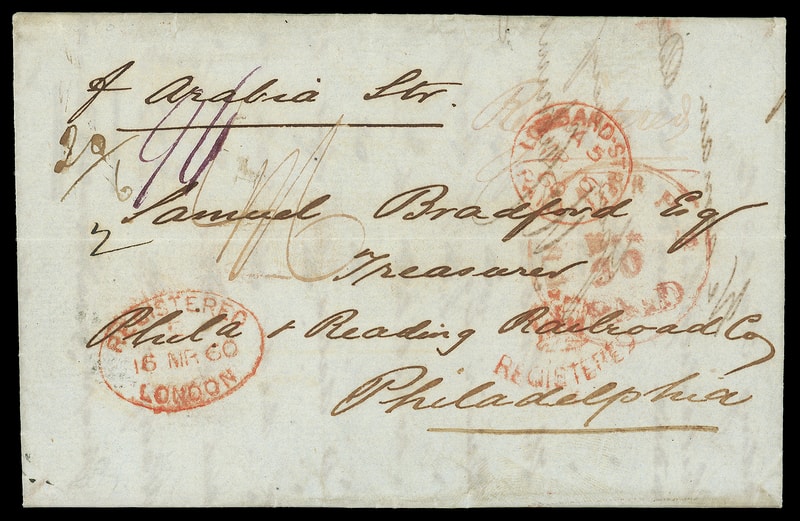 1860 (Mar. 16) London, England to Philadelphia Pa., folded letter with red "Lombard-Street, Paid, MR 16" cds, "Registered, London, 16 MR 60" oval postmark and matching "Registered" Crown handstamp, red manuscript " 4/6 " prepaid rating for four-times the 1s packet rate plus 6d registration, manuscript " 20/6 " credit of 26¢ for four-times 5¢ inland plus 6¢ registry fee, carried as endorsed by Cunard Line Arabia from Liverpool Mar. 17th to New York arriving Mar. 30th, red Philadelphia "Phila. Br. Pkt., Paid, Mar 30" exchange cds and magenta " 96 " quadruple rate restatement