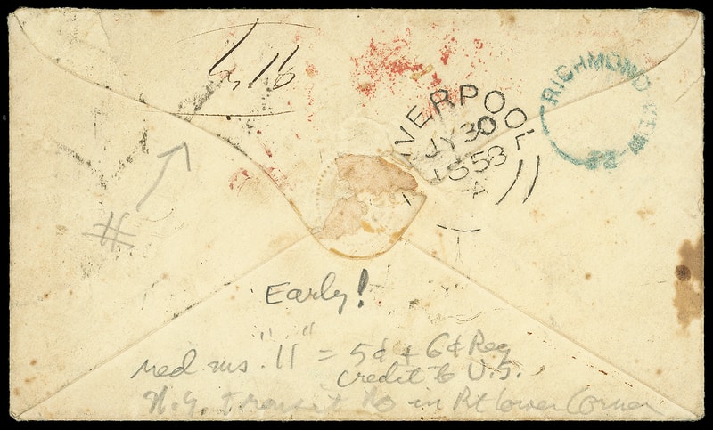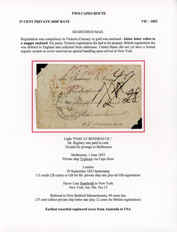 1853 (Jun. 1) Melbourne, Victoria to New Bedford Mass., datelined folded letter with partial indistinct " Paid at Bendigo CK. " and red manuscript " Registered " and "2" pence prepaid to Melbourne, reverse with partial "Melbourne, Victoria, JU 1, 1853" rimless backstamp, carried by private ship Typhoon via Cape Horn to England, red London (9.29) transit backstamp with "1/2" due rating updated to "28" cent debit to U.S., carried by Havre Line Humboldt from Southampton Oct. 1st to New York arriving Oct. 14th, "New.York, Am. Packet. Oct 15" exchange cds with manuscript. " 49 " cent due rating; cover tears and wear, Fine and rare.