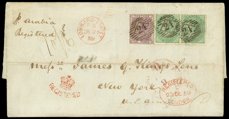 1859 (Dec. 23) London, England to New York N.Y., folded letter bearing Great Britain 6d purple, 1s green pair canceled by "24" barred ovals, red "Lombard-Street, DE 23 '59" cds, red "Registered, London, 23 DE 59" oval and matching "Registered" Crown handstamp, ms. "10/6" rating, carried as endorsed by Cunard Line Arabia from Liverpool departing Dec. 24th to New York arriving Jan. 8th, partial red "N. York, Br. Pkt., Jan 9" credit exchange cds; horizontal fold, Very Fine and scarce registered use.