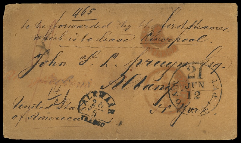 1854 (May 26) Alkmaar, Holland to Albany N.Y., buff cover with "Alkmaar, Franco 26/5" postmark and red script "Aangeteekend straightline, reverse with ms. "10/80" totalled to "90" Dutch cents, red London (5.29) transit cds with matching "Registered" crown handstamp, red ms. "1/" rating for transatlantic packet, carried on Collins Pacific from Liverpool May 31st to New York arriving Jun. 11th, black "N.York, Am. Pkt. '21' Jun 12" debit exchange cds, ms. "465" registry number at top; edge wear, F.-V.F. and rare early registered use from Holland.