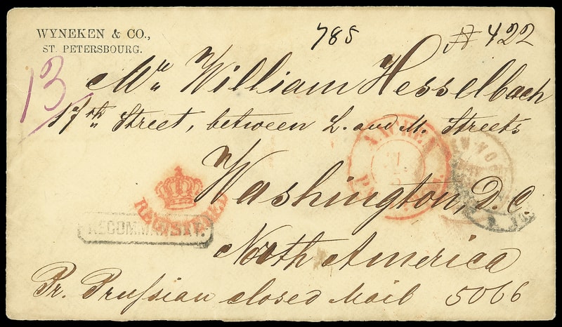 1860 c. (Apr.) St. Petersburg, Russia to Washington D.C., registered cover with partial St. Petersburg double-circle datestamp and matching "Recommandirt." framed handstamp, magenta "13" rating, endorsed "Pr. Prussian closed mail" at bottom, red "Aachen, Paid 23 cts., 1/5" double-circle transit exchange credit and bold "Registered" Crown handstamp, red "New-York May 13" exchange cds; small left edge tear, Very Fine and rare transatlantic registered use from Russia.