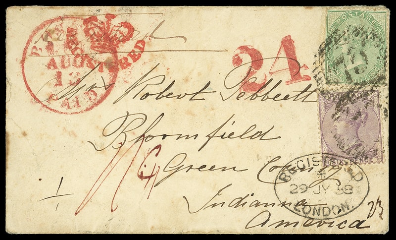 1858 (Jul. 29) London, England to Bloomfield, Ind., cover bearing Great Britain, 6d purple, 1s green tied by "75" barred ovals and "Registered, London, 29 JY 58" oval, bold red "Registered" Crown handstamp, New York ms. "23" registry number transit and bold "24" credit handstamp, red "Boston, 5 Paid, Aug 13" credit exchange cds; edge wear and tear at left, 1s irregular perfs at left, F.-V.F. and early transatlantic registered cover.