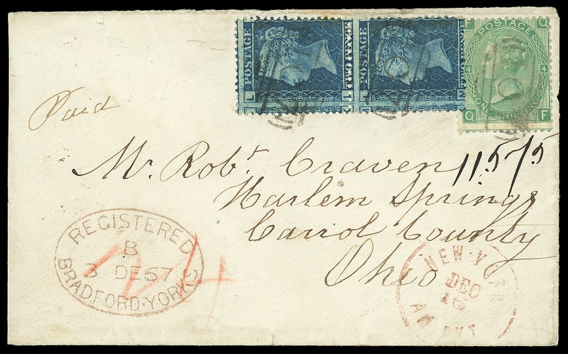 1867 (Dec. 3) Bradford, England to Harlem Springs, Ohio, cover bearing Great Britain 1d blue vertical pair and 1s green tied by "107" barred ovals, reddish "Registered, Bradford-Yorks., 3 Dec 67" oval, ms. "11575" registry number, red "Registered, Liverpool, DE 3 '67" double-circle backstamp; red "New-York, Am. Pkt. Dec 16" exchange cds and red crayon " 24 " credit; reduced slightly at left, Very Fine.