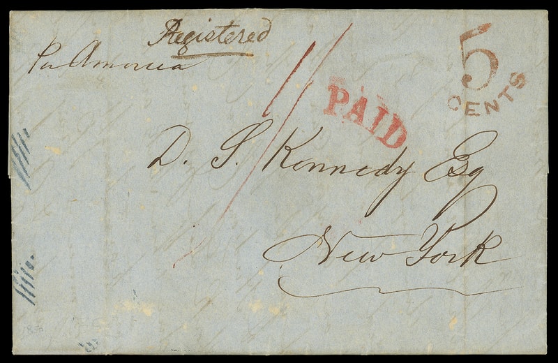1850 (Jul. 4) Irvine, England to New York N.Y., blue folded letter endorsed " Registered " at top with blue "Irvine, JY-4, 1850" double-arc origin backstamp and magenta ms. " 1/ " rating, blue Liverpool (7.5) transt backstamp and red "5 Cent" credit handstamp, carried by Cunard America from Liverpool Jul. 6th to New York arriving Jul. 21st where red "Paid" arc h.s. struck; file folds, F.-V.F. and scarce early inbound registered cover.