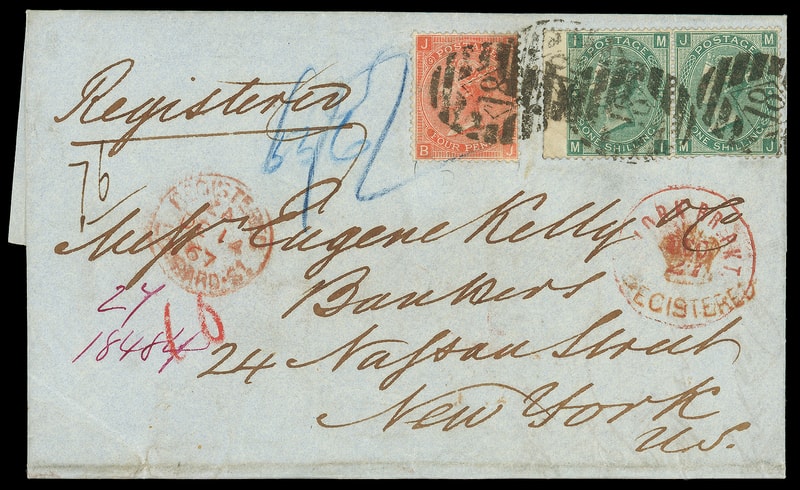 1867 (Dec. 14) London, England to New York N.Y., blue folded letter bearing Great Britain 4d vermilion, 1s green pair , tied by "18" barred ovals, red "Registered, Lombard St., DE 14 '67" cds and matching "Registered" Crown handstamp, endorsed "Registered", carried by Cunard Line Scotia from Liverpool Dec. 14th to New York arriving Dec. 26th, red "N. York, Br. Pkt. Dec 27" exchange cds; right 1s perf flaws, fresh and Very Fine.
