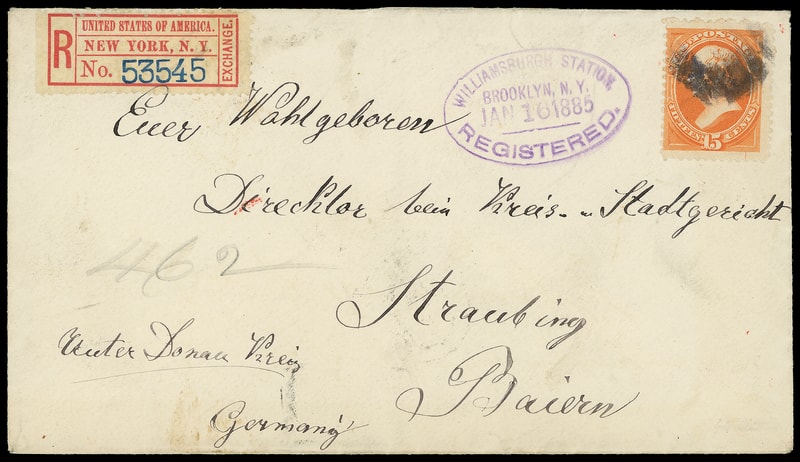 Registry Exchange Label, New York, NY, printed name, blue "53545" handstamp, affixed on 1885 cover bearing 15¢ orange (189) tied by grid cancel, purple "Williamsburgh Station, Brookyn, N.Y., Registered. Jan 16, 1885" oval to Straubing, Germany , New York C (1.17) examiner's backstamp, Straubing (1.28) arrival backstamp, fresh and Very Fine.