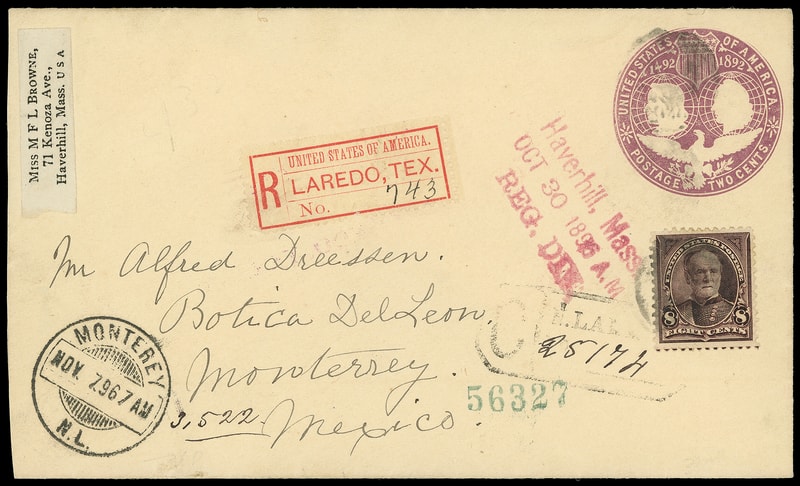 Registry Exchange Label, Laredo, TX, printed name, ms. "743" number, affixed on 2¢ Columbia (U349) entire with purple "Haverhill, Mass. Oct 30 1896 A.M., Reg. Div." three-line postmark bearing 8¢ violet brown (272) , small tear, tied by corks, purple "Laredo, Tex. No 4 1896" straightline backstamp, bold Monterey (11.7) arrival cds; reduced at left, Very Fine.