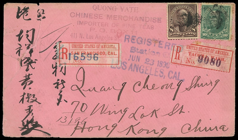 Registry Exchange Label, Tacoma, WA, printed name, black "9080" number, affixed on 1898 pink cover bearing 8¢ violet brown (272) and 10¢ dark green (273) , tied by cork cancels, blue "Registered, Station, Jun 23 1898, Los Angeles, Cal." four-line postmark to Hong Kong, China , San Francisco (6.25) backstamp and San Francisco, Cal. (FX-SF1a) exchange label affixed, Tacoma (6.27) transit backstamp, Hong Kong arrival backstamp; cover torn top left, Fine and scarce Tacoma exchange label, only 15 recorded .