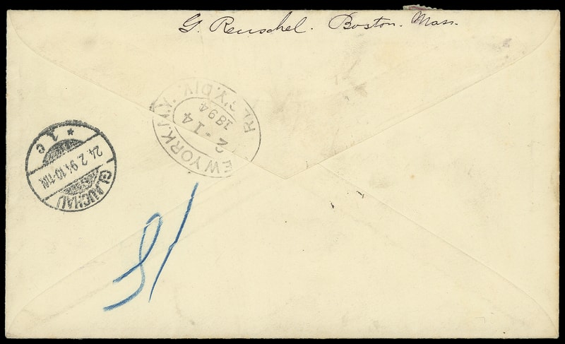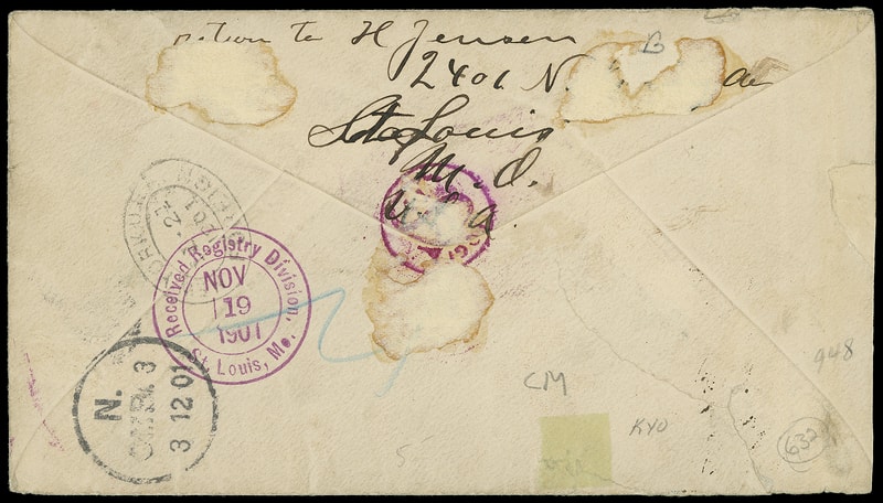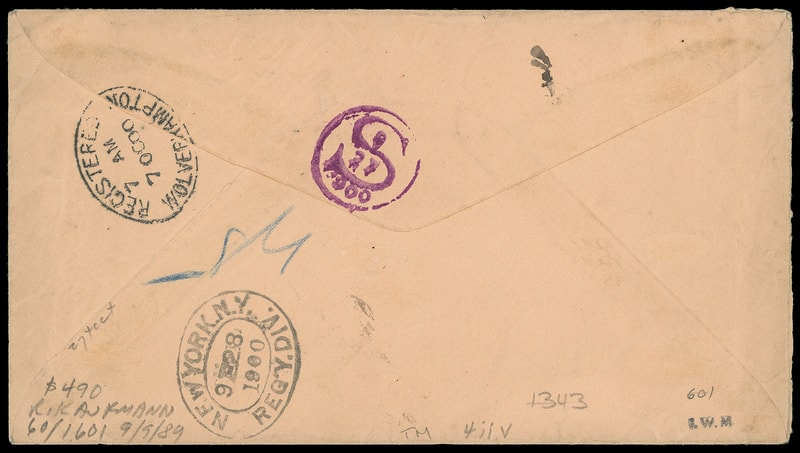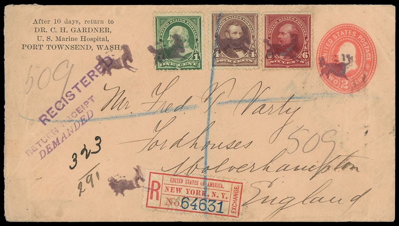 Registry Exchange Label, New York, NY, printed name, blue "64631" handstamp, affixed on 2¢ pink fawn entire bearing 1¢ green (279) , 4¢ rose brown (280) and 6¢ lake (281) , each tied by strike of Kicking Mule (AN-11) fancy cancel , faint 1900 ultramarine Port Townsend, Washington Terr. registry postmark to Wolverhampton, England , purple "Registered." and "Return Receipt, Demanded" handstamps, New York (9.28) oval backstamp, "Registered, Wolverhampton" (10.7) arrival oval backstamp; some edge wear, Very Fine, ex-Landau .