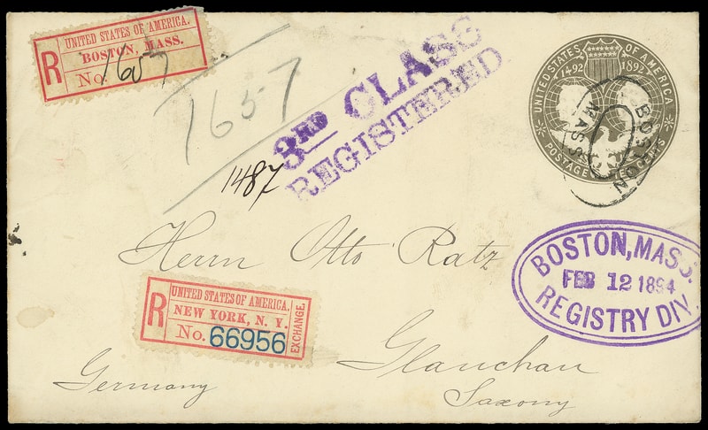 Registry Exchange Label, Boston, MA, printed name, ms. "1651" number, affixed on 10¢ Columbian (U350) entire canceled by "Boston, Mass." oval, bold purple "Boston, Mass. Registry Div. Feb 2 1894" oval and "3RD Class / Registered" two-line handstamp to Glanchau, Germany , New York (2.14) oval backstamp and New York (FX-NY1a) exchange label affixed, Glanchau (2.24) arrival backstamp, Very Fine.