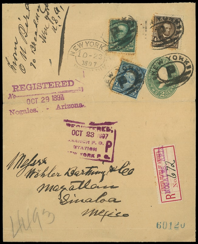 Registry Exchange Label, Nogales, AZ, handstamped name, ms. "672" number, affixed on registered 2¢ green manila wrapper bearing 1¢ blue (264) , 4¢ dark brown (269) and 10¢ dark green (273) , all tied by "New York, P" station ovals, purple "Registered, Oct 23 1897, Branch P.O. P, New York P.O." framed postmark, additional "New York, Reg'y Div. 10-23, 1897" oval, purple "Registered, Oct 29 1897, Nogales, - Arizona" three-line postmark; some perf toning, 10¢ corner crease, Very Fine and scarce wrapper to Mexico, only 6 recorded examples .