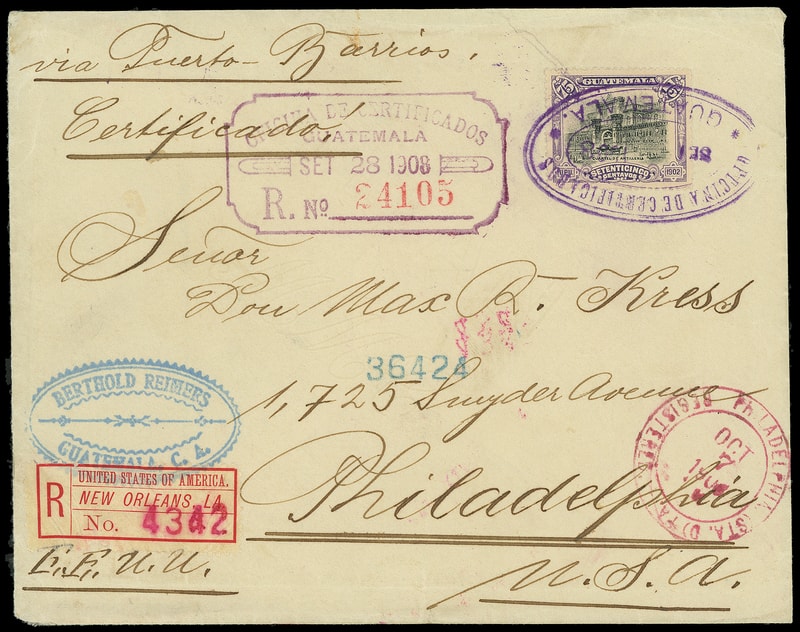 Registry Exchange Label, New Orleans, LA, printed name, magenta "4342" number, affixed on 1908 incoming cover from Guatemala via New Orleans to Philadelphia Pa. bearing Guatemala 75c black & purple and large 10c, 12½c, 20c franking covering reverse, all tied by purple (9.28.1908) oval, reverse with New Orleans, La. (10.6) transit and Philadelphia (10.8) arrival cds, Very Fine.