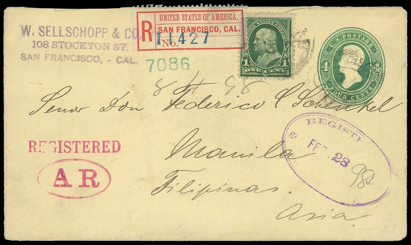 Registry Exchange Label, San Francisco, CA, printed name in sans-serif letters, blue "11427" handstamp number, affixed on 4¢ green (U251) amber entire to Manila, Philippines bearing 1¢ green (279) single and block of eight on reverse, tied by indistinct ovals, partial purple "Registered, Feb 28 98" oval postmark, magenta "Registered" straightline and oval "AR" handstamp; slightly rough opening, otherwise Very Fine and scarce destination.