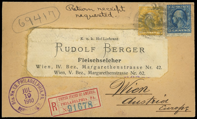 Registry Exchange Label, Philadelphia, PA, printed name in serif letters, blue "91678" handstamped number, affixed on cover bearing 5¢ blue (335) and 10¢ yellow (338) tied by "Philadelphia Pa., RD" oval, purple "Sta. No. 69, Philadelphia, Pa. Registered, Jul 19, 1910" cds with address label to Vienna, Austria , Very Fine.
