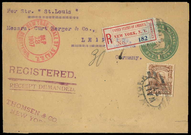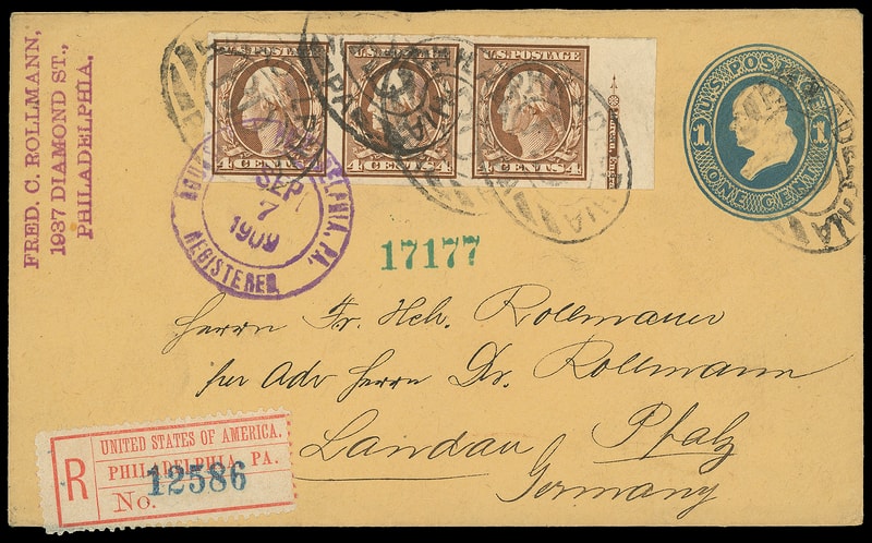 Registry Exchange Label, Philadelphia, PA, printed name in serif letters, blue "12586" handstamped number, affixed on 1¢ blue (U116) entire bearing 4¢ orange brown (346) strip of three with right imprint selvage , tied by "Philadelphia Pa., RD" oval and purple "Philadelphia, Pa. Registered, Sep 7, 1909" cds to Landau, Germany , additional New York greenish blue "17177" registry number handstamp, Very Fine and choice Philadelphia exchange label use to Germany.