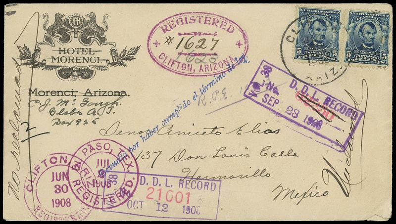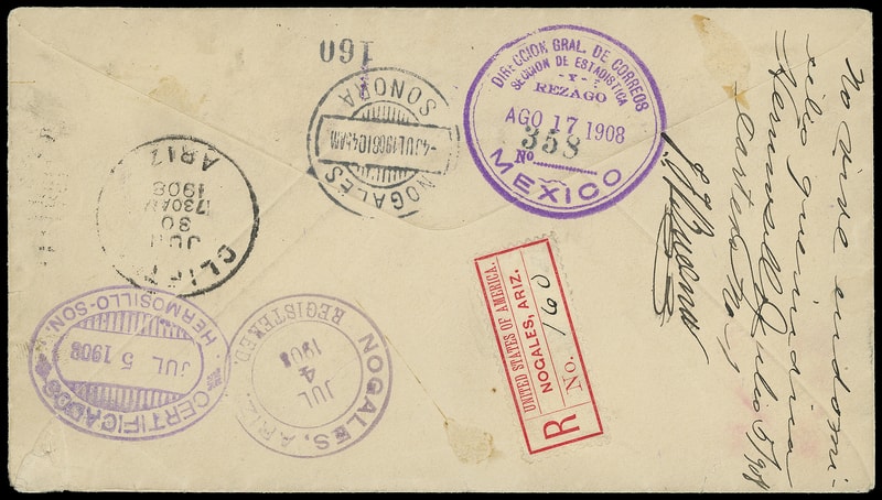 Registry Exchange Label, Nogales, AZ, printed name, ms. "160" number, affixed on reverse of cover bearing 5¢ blue (304) pair tied by "Clifton, Ariz. Jun 30, 1908" duplex to Hermarillo, Mexico , fancy purple "Registered, Clifton, Arizona '#16627' " ova and matching "Clifton, Ariz. Registered, Jun 30 1908" cds, purple El Paso (7.2) transit cds, reverse with blue Nogales (7.4) transit, Nogales Mex. (7.4) entry and Hermosillo (7.5) arrival oval, cover not claimed and returned via D.L.O.; small bottom right corner flaw, Very Fine and scarce label.