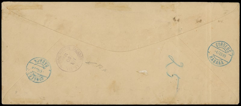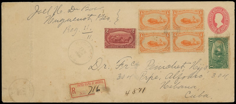 Registry Exchange Label, Jacksonville, FL, blank, no name, with ms. "716" number, bit missing, affixed on legal-size 4¢ pink (U325) entire bearing 1¢-2¢ Trans-Mississippi (285-286) singles and 4¢ Trans-Mississippi (287) block of four, each tied by four-ring target, matching "Huguenot Ga. Jan 28, 1899" cds to Havana, Cuba , Jacksonville (1.30) transit backstamp and two Havana (2.4) arrival cds; creased at left with some splitting, light overall toning, Fine and scarce Jacksonville exchange label use.